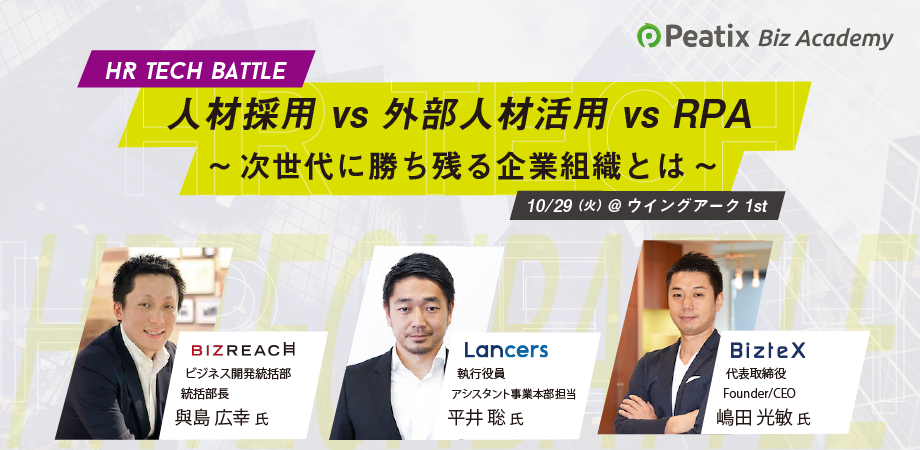 昨年10月29日に、「次世代に勝ち残る企業組織」をテーマにHRテックバトルを繰り広げる、トークセッションを開催しました。登壇者は、即戦力人材に特化した転職サイトを運営するビズリーチ、クラウドソーシングを展開するランサーズ、日本初のクラウドRPA「BizteX cobit(ビズテックス コビット)」を提供するBizteXの3社。会場には、1000名以上の大企業様から50名以下の中小企業様まで、たくさんの方にお越しいただきました。当日の様子をイベントレポートとしてお届けします。